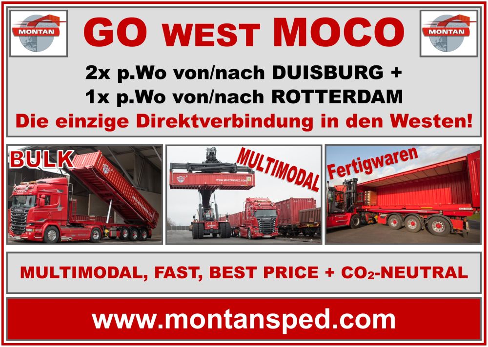 GO WEST MOCO lautet somit das aktuelle Motto der Montan Spedition. Diese schnelle und CO2-neutrale Zugslösung wird zu attraktiven Preisen angeboten und ist aktuell die einzige multimodale Direktverbindung zwischen dem Linzer Zentralraum, Rhein-Ruhr und Rotterdam, und somit zwischen den größten westeuropäischen Schwerindustriezentren. Buchen sie ihre West-Verkehre jetzt unter